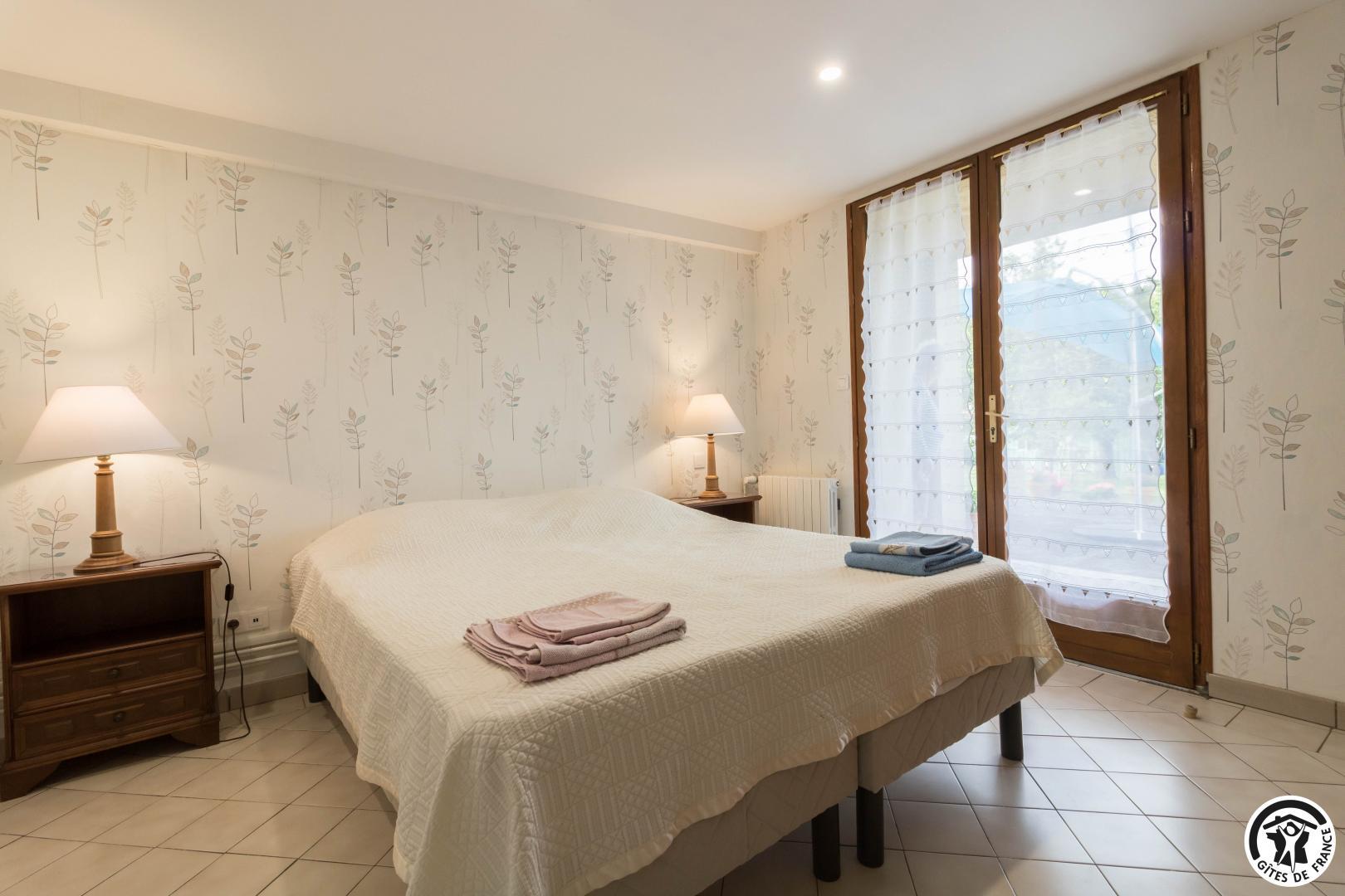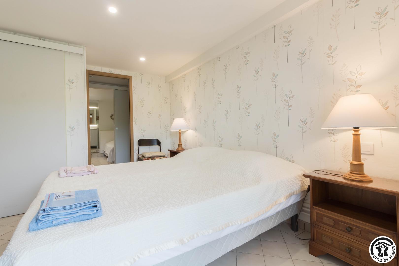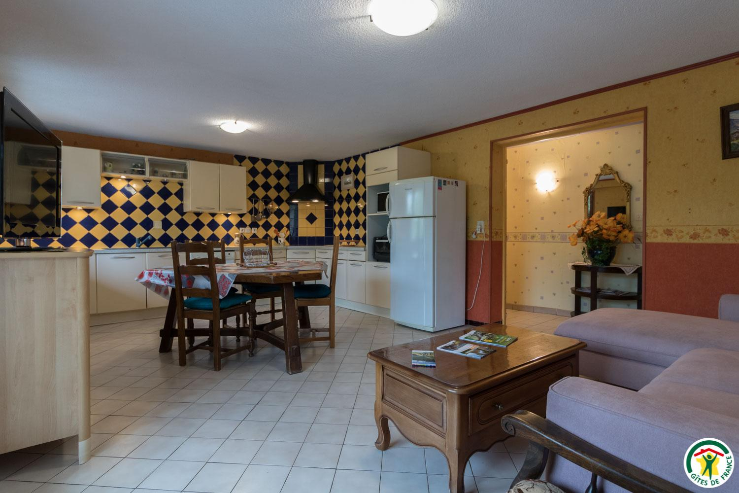 L’hébergement, étant de plain-pied (au rez-de-chaussée de la maison de la propriétaire), sera facile d’accès pour les personnes ayant des difficultés à se déplacer : séjour de 27m2, avec belle cuisine (réfrigérateur-congélateur, lave-vaisselle, micro-ondes, 4 plaques à induction, four à poser et appareil à raclette), coin repas et coin salon (canapé, table basse et grande TV écran plat de 120cm), couloir desservant 2 chambres, une avec 2 lits simples en 90x190cm jumelables, et l’autre avec 1 lit pour 2 personnes en 160*200cm (18m2). Chaque chambre possède sa salle d’eau avec WC.