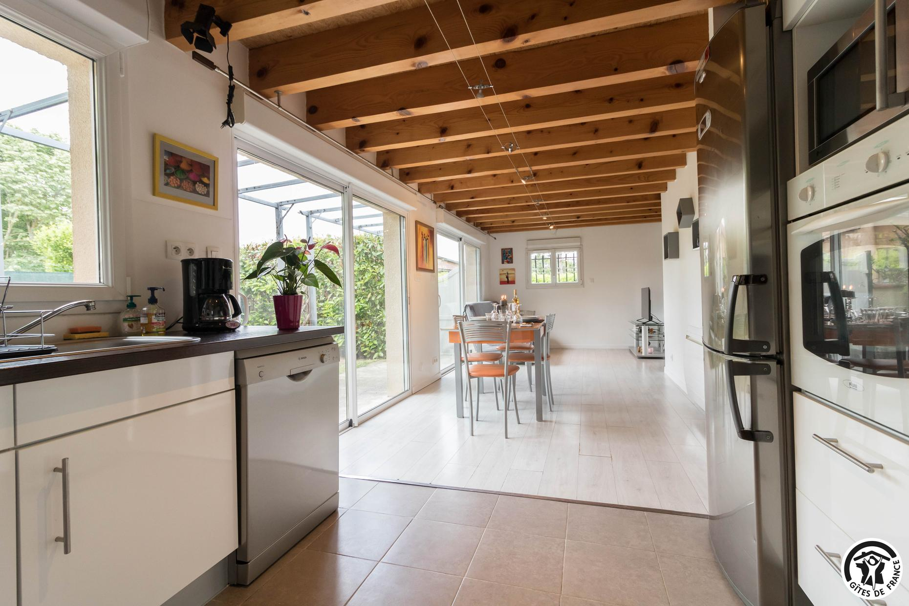 Le gîte fait 50m2 et possède un séjour comprenant une cuisine intégrée (4 feux gaz, four, micro-ondes, réfrigérateur-congélateur, lave-vaisselle, bouilloire, grille-pain, cafetière, appareil à fondue et à crêpe), une table pour manger et 4 chaises ainsi qu’un coin salon (canapé convertible en 160*200cm et TV écran plat), 2 chambres (1 lit double en 140*190cm)(2 lits simples en 90*190cm), une salle d’eau (cabine de douche, vasque et lave-linge) et un WC indépendant. Climatisation réversible. Barbecue, salon de jardin, table de ping-pong et jeu de fléchette dans le jardin. Jardin privatif clos avec terrasse. Animaux admis. Internet et TV par fibre optique. Métro Balma-Gramont ou Argoulet à 7 min par A68.