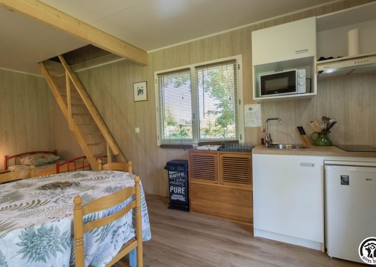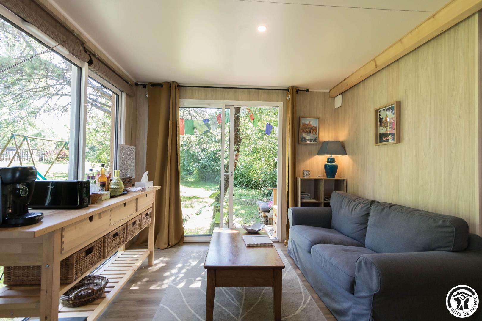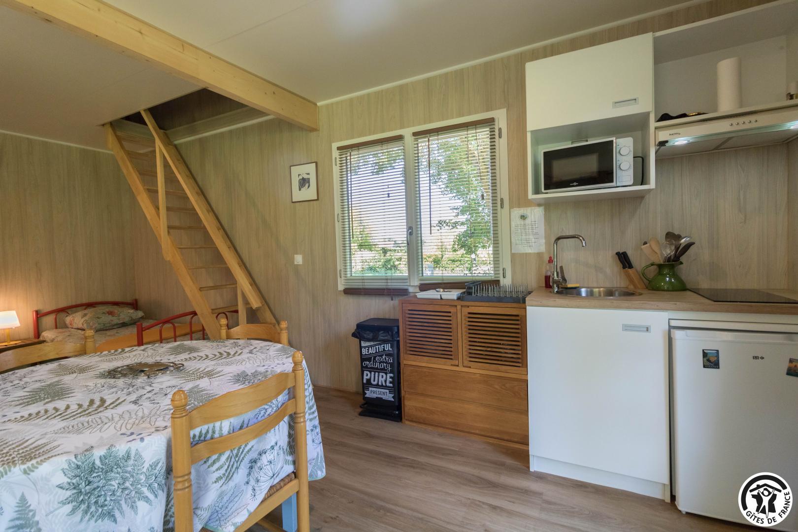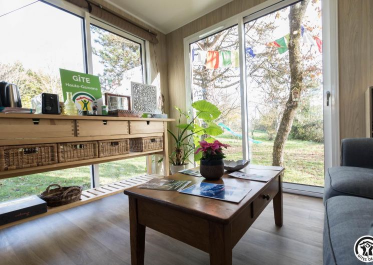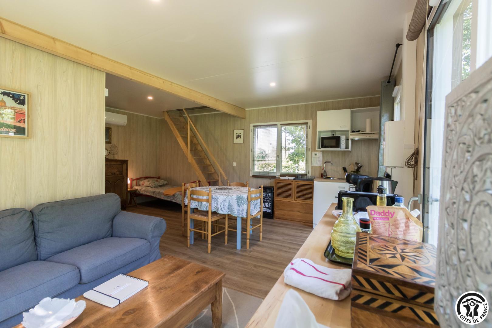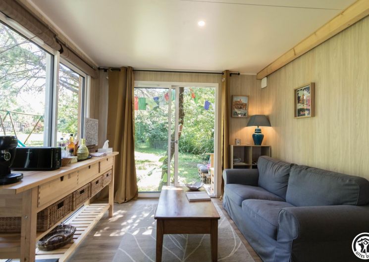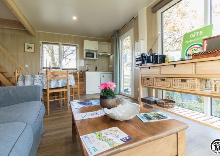 Construite en bois, les baies vitrées de cet hébergement atypique vous feront baigner dans la lumière. Le premier niveau est constitué d’un vaste séjour (cuisine intégrée, coin salon, espace repas et lit simple en 90*190cm) et d’une salle d’eau avec WC (accessibilité facilitée). Le lit double en 140*190cm est situé dans la mezzanine (escalier raide) et donne sur un petit balcon, parfait pour apprécier le paysage du Lauragais et la chaine des Pyrénées.