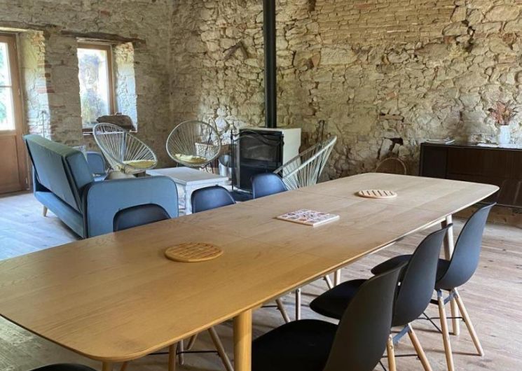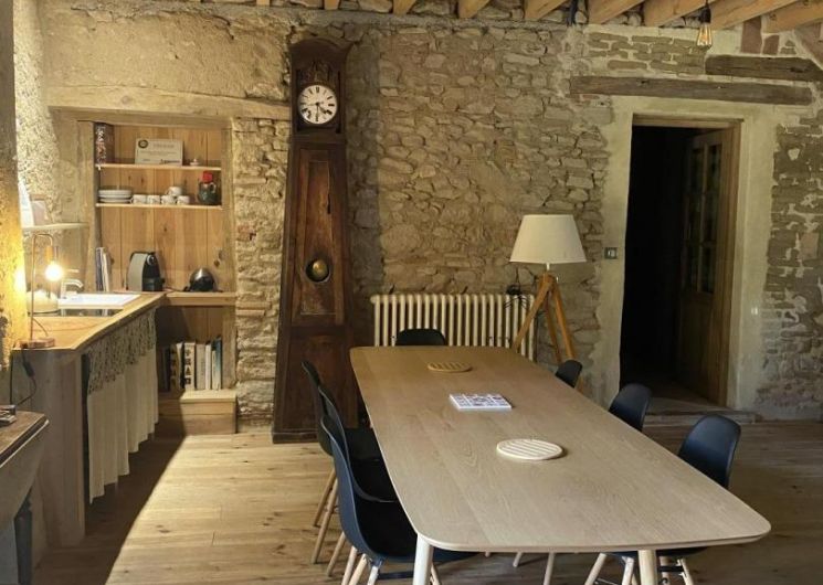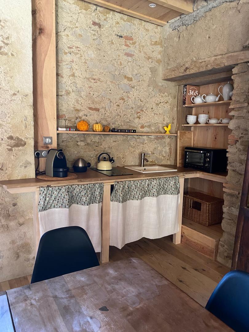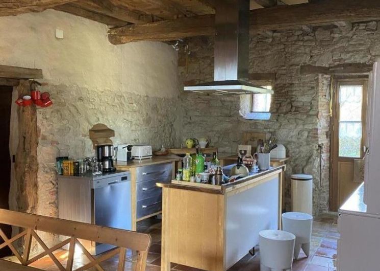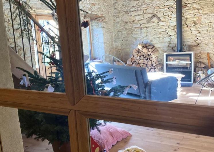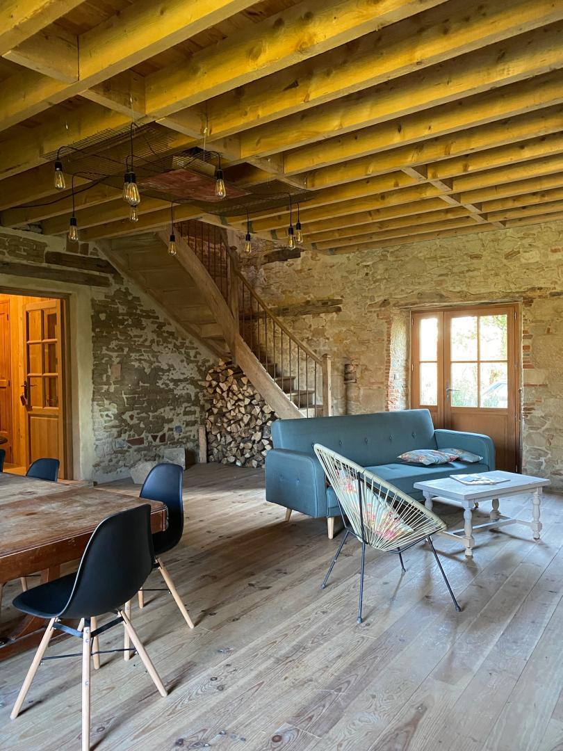 – Rez-de-chaussée : entrée, cuisine (grande table familiale), salle à manger, cellier/buanderie, séjour chauffé par un poêle à bois avec coin petit-déjeuner/boissons chaudes, WC.
