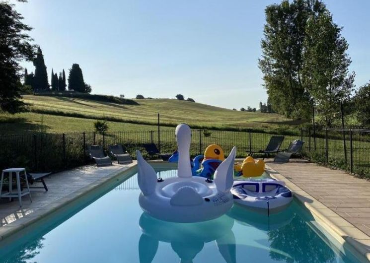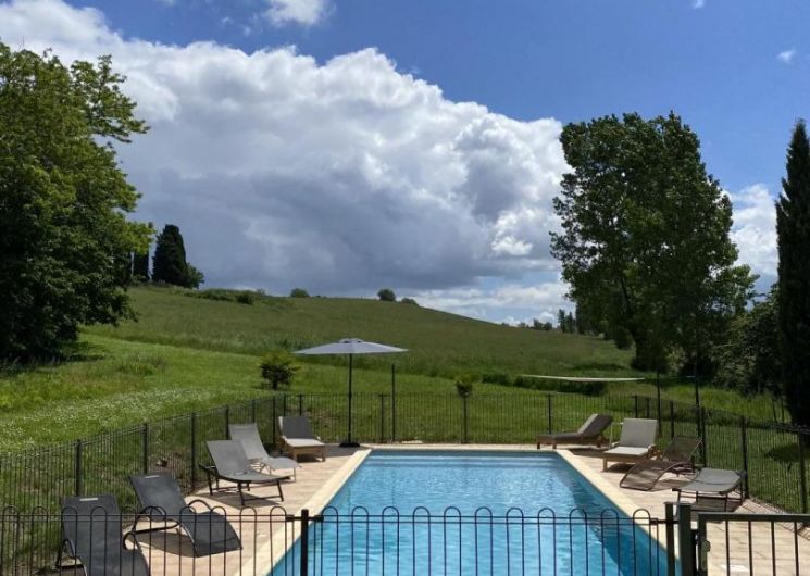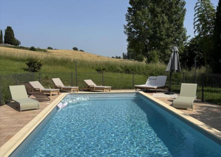 Cette grande maison a bénéficié d’une restauration privilégiée avec des matériaux naturels (bois et chaux) et en respectant les éléments patrimoniaux (charpente apparente dans la tour, cheminées monumentales Renaissance). Vous profiterez d’une piscine au sel privative au gîte (11x4m) protégée par clôture en fer forgé. Grand jardin privatif non clos.